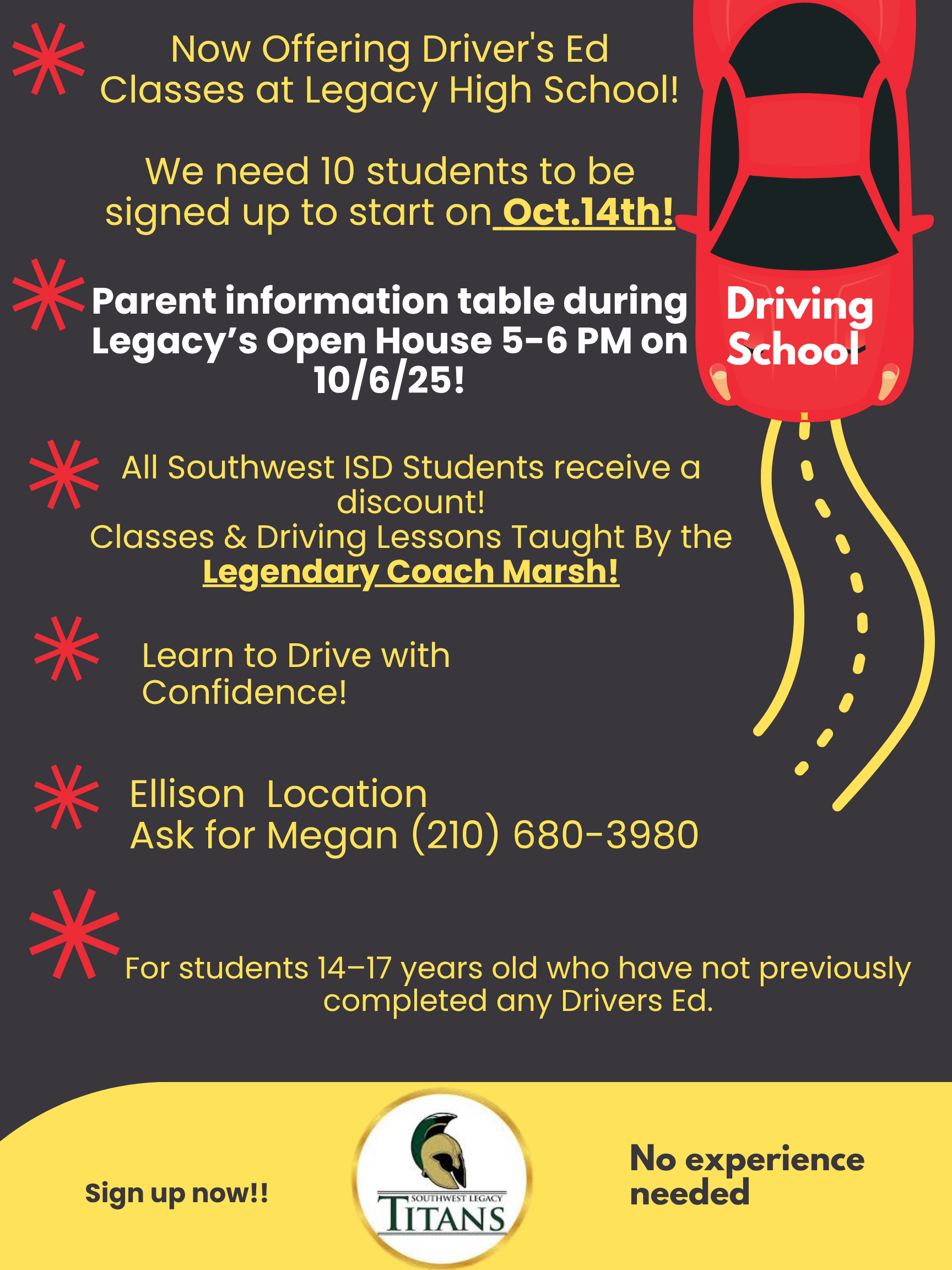 We’re thrilled to announce that Southwest Legacy High School is partnering with Rhodes Driving School to bring Driver’s Education classes directly to our campus! This exciting opportunity allows students to learn from the legendary Coach Marsh and gain the confidence and skills needed to become safe, responsible drivers — all while earning valuable experience close to home.