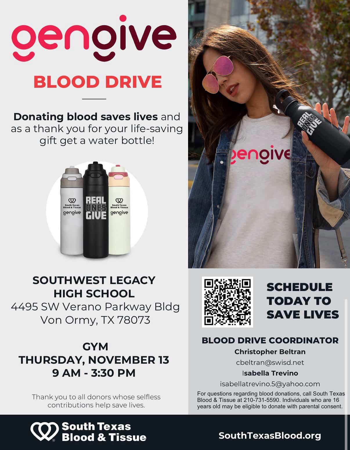 Join us for the GenGive Blood Drive at Southwest Legacy High School on Thursday, November 13 from 9:00 AM β 3:30 PM in the Gym! πͺ
