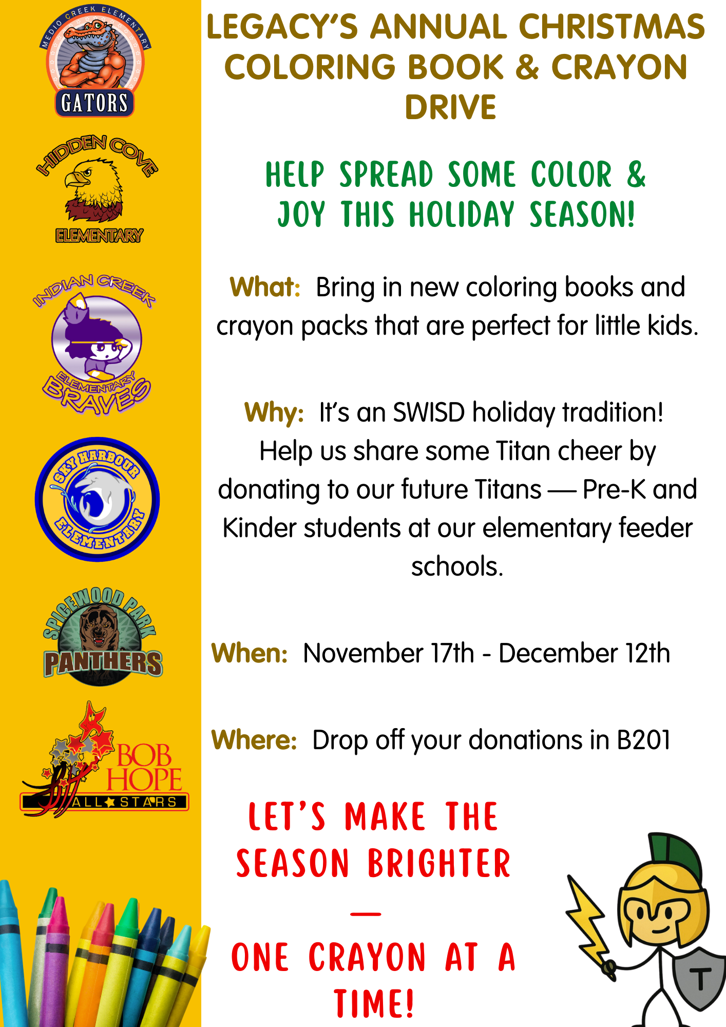 Help us spread some COLOR and JOY this holiday season! We’re collecting new coloring books and crayon packs for our littlest future Titans — Pre-K and Kinder students at our SWISD feeder elementary schools. 💚💛